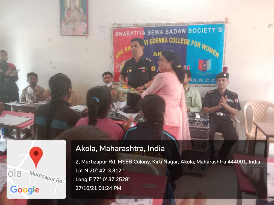 Appreciation by Hon. Mr. Diliprajji Goenka, President, BSS, Dr. Devendra Vyas, Principal & 11 Mah. BN NCC, Akola COL. Sanjay Pande