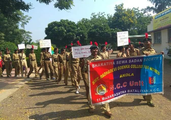 In the year 1972-73, the NCC girls department was started in Smt Radhadevi Goenka College for women Akola under the 11 Maharashtra Battalion NCC Akola, The NCC department of the college has the strength of 94 girl cadets.Continuing the path of unity and discipline, the NCC department is in progress. The results of the 'B' and 'C' certificate exam in the NCC department are highly appreciated. Till date our NCC cadets, participated in (RDC) Republic Day camps and (TSC) Thal Sena Camps at New Delhi. Apart from this our NCC cadets are participating in ATC, NIC, Trekking camp, Army attachment camp, BLC etc. in every year.