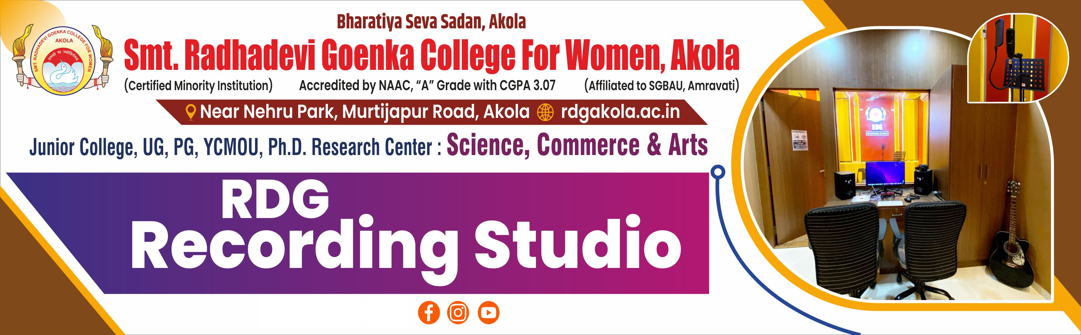 RDG Recording Studio is a state-of-the-art facility at Smt. RDG College for Women, Akola, dedicated to providing professional recording services. Our studio offers comprehensive solutions for artists and content creators, including song recording, demo recordings for singers, YouTube song production, voice recording for professional programs, and devotional song recording. With modern equipment and expert technical support, we ensure high-quality audio output for all your recording needs.
