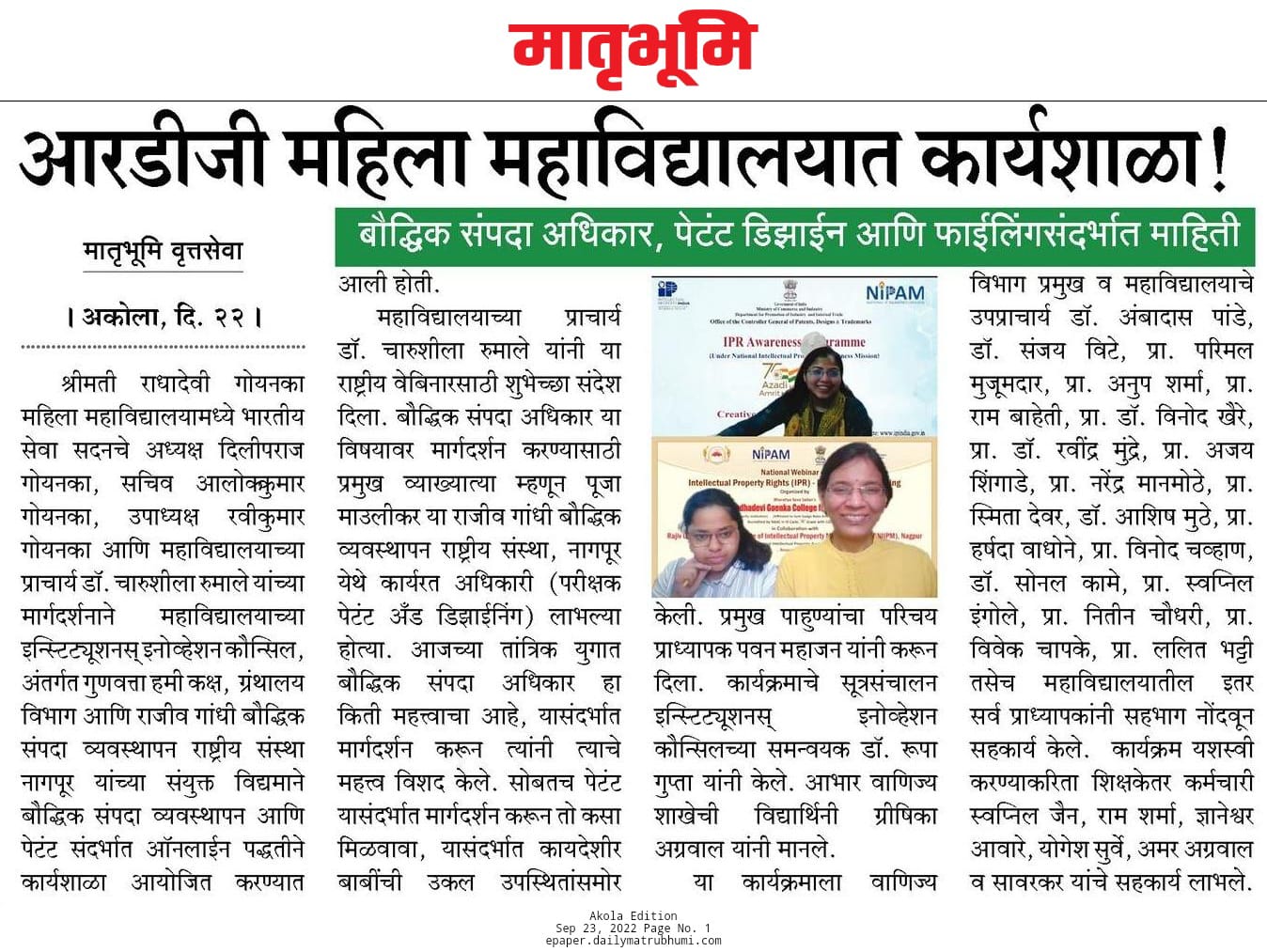 Organized by Smt. Radhadevi Goenka College for Women, Akola in collaboration with Rajiv Gandhi National Institute of Intellectual Property Right Management (RGNIPM), Nagpur