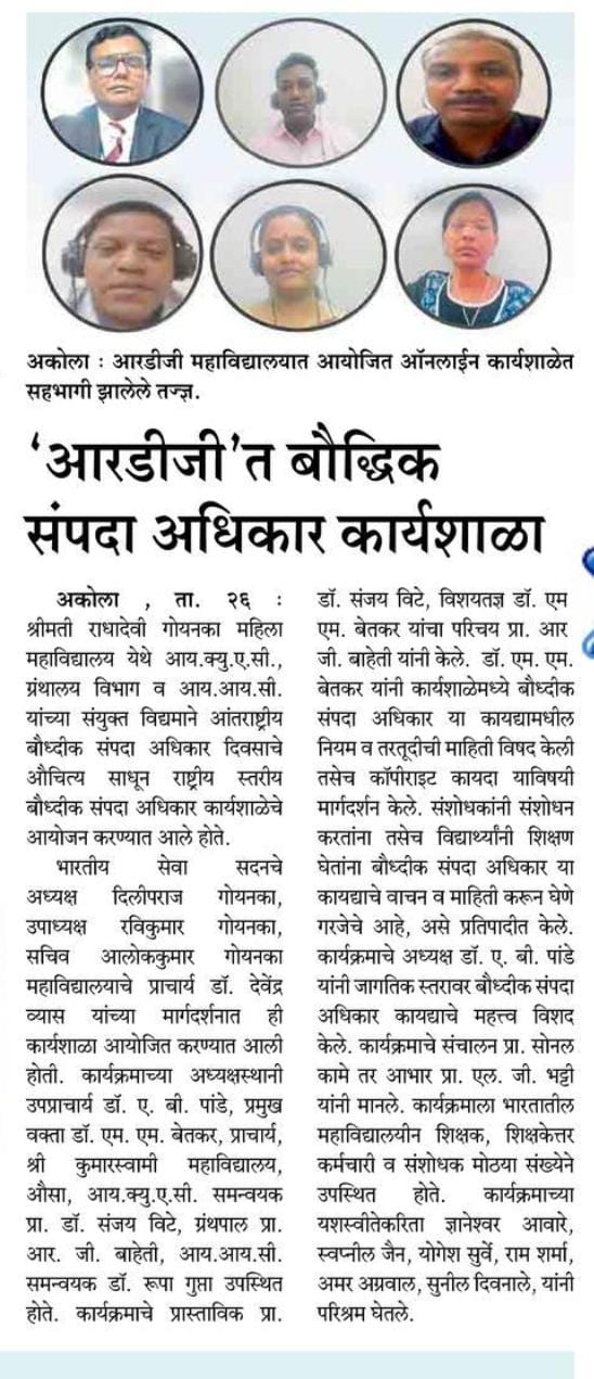 One Day National Level Online Workshop on Intellectual Property Right & IP Management of Start-Up on 26th May, 2022 in collaboration with Internal Quality Assurance Cell and Department of Library.