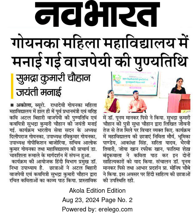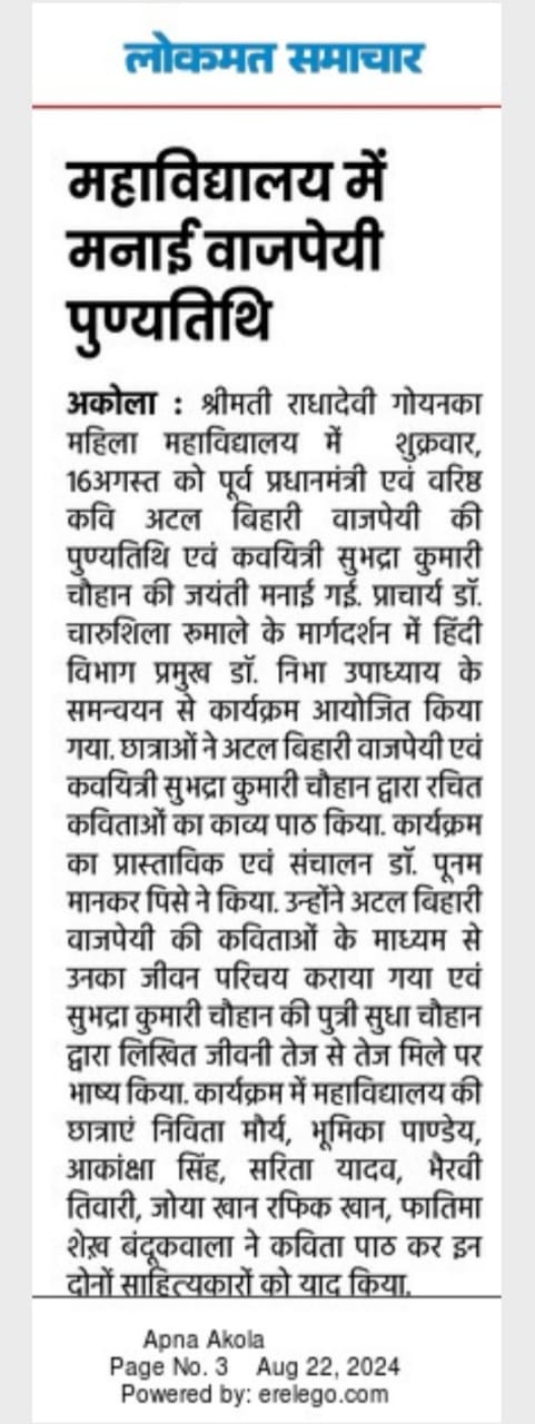 अटल बिहारी बाजपेयी पुण्य तिथि एवं सुभद्राकुमारी चौहान जयंती