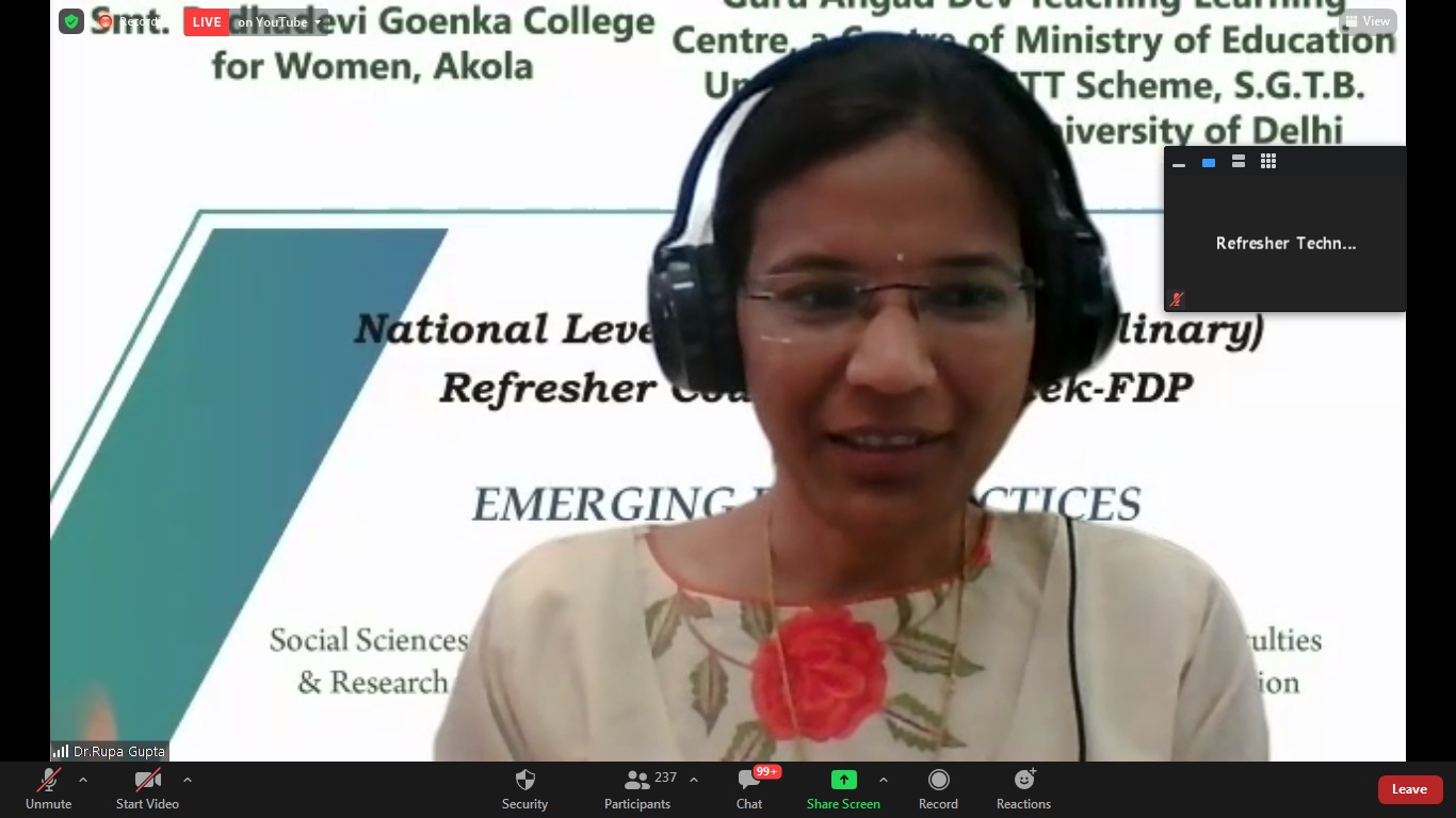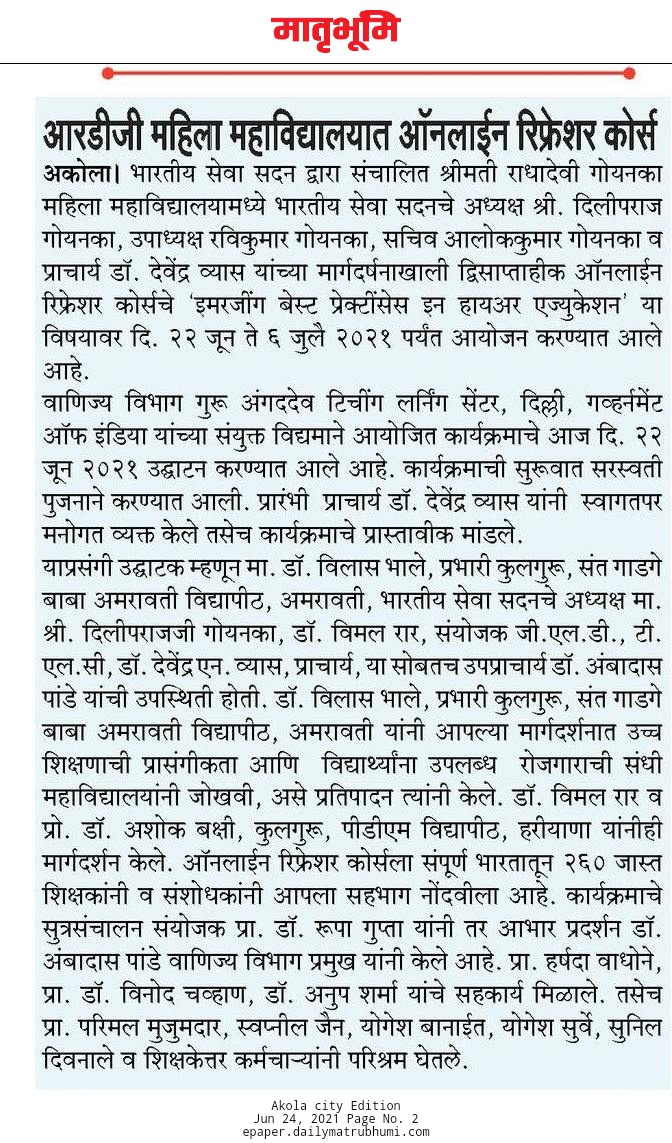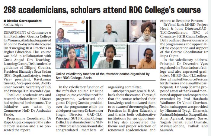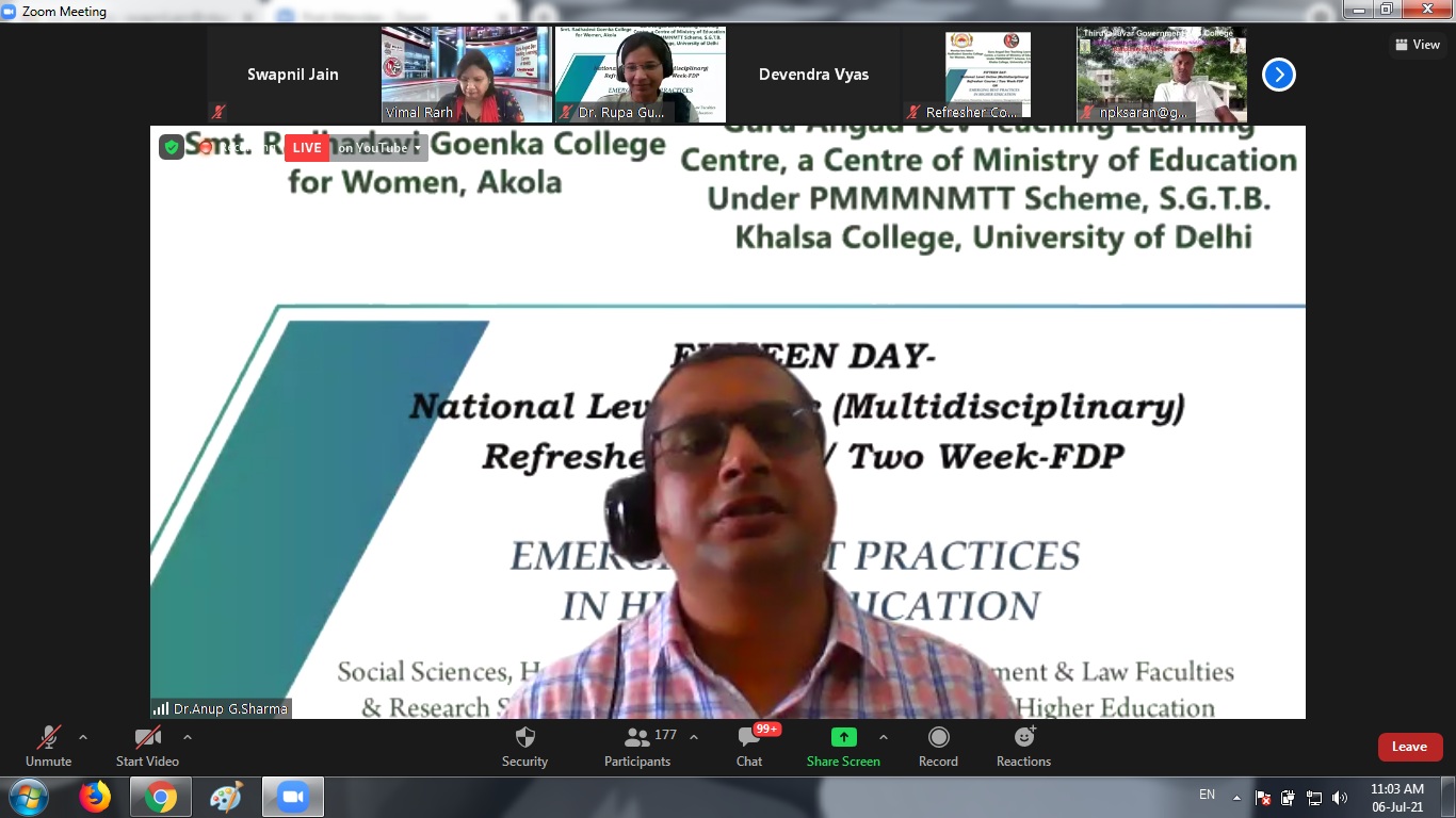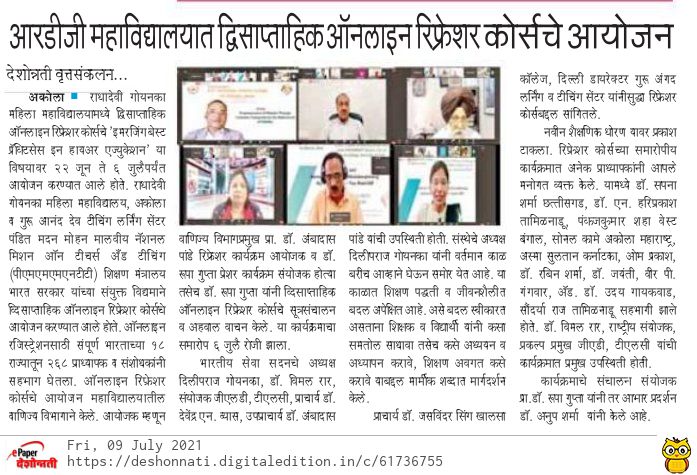Department of Commerce of Smt. Radhadevi Goenka College for Women, Akola (M.S.) in collaboration with Guru Angad Dev Teaching Learning centre of SGTB Khalsa College, Delhi University (under PMMMNMTT scheme) is organising 15 Days National Level Online Refresher /Two Weeks FDP (Multidisciplinary)on the theme: