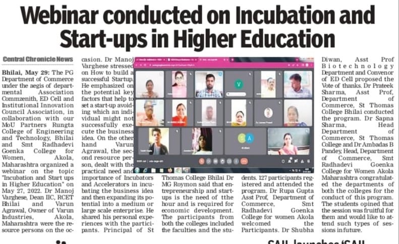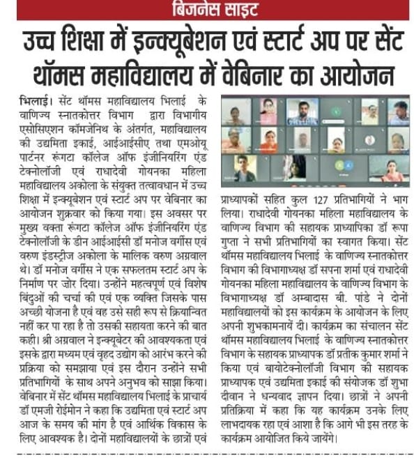 Organized by Institution's Innovation Council & PG ,Department of Commerce, St. Thomas College, Bhilai (CG) & Institution's Innovation Council & PG ,Department of Commerce, Smt. Radhadevi Goenka College for Women, Akola (M.S) in collaboration with Institution's Innovation Council of Rungta College of Engineering & Technology, Bhilai (R1)