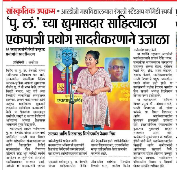 २०१० साला पासून पद्व्युत्तर मराठी विभाग सुरु करण्यात आला. महाविद्यालयामध्ये मराठी विषय शिकत असलेल्या विद्यार्थ्यांची संखया ८०२ तर मराठी साहित्य १३६ विद्यार्थी शिकत आहेत.