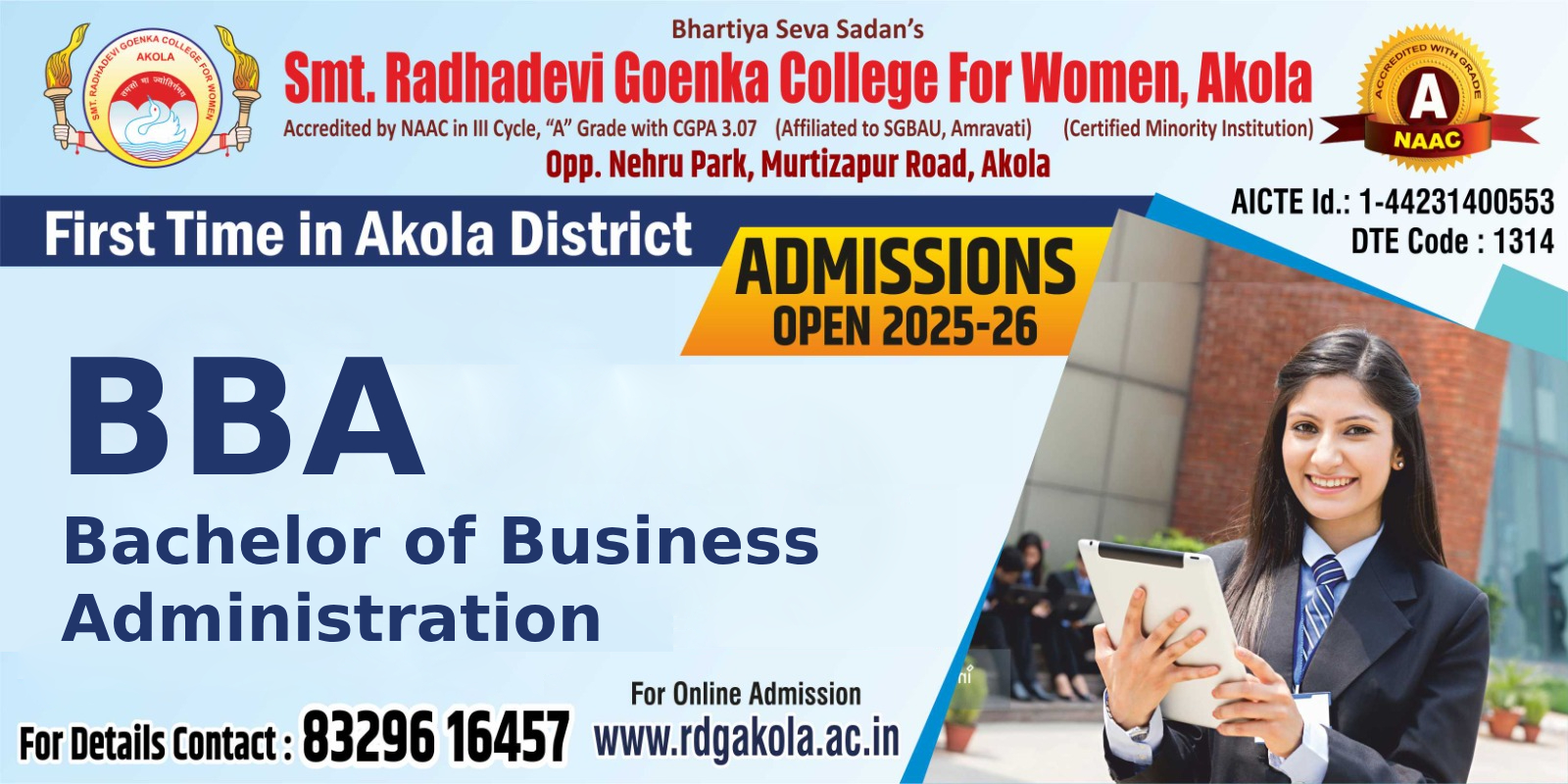 Smt. Radhadevi Goenka College for Women, Akola, offers a Bachelor of Business Administration (B.B.A.) program aimed at developing future business leaders and managers. This three-year, full-time course provides students with comprehensive knowledge in business management, finance, marketing, and entrepreneurship. The program is designed to prepare students for dynamic roles in the corporate world and to pursue higher education like MBA. Eligibility criteria include successful completion of 10+2 in any stream (Arts/Commerce/Science) from a recognized board, with admissions granted on a merit basis. The college provides state-of-the-art facilities, including modern classrooms, a library, and student support services like NCC, NSS, and a placement cell.