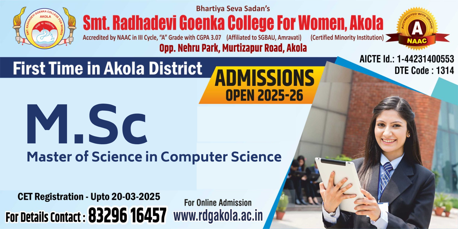 Smt. Radhadevi Goenka College for Women, Akola, offers a Master of Science in Computer Science (M.Sc. Comp. Sci.) program aimed at providing advanced knowledge in computer science and its applications. This two-year, full-time postgraduate course is designed to deepen students' expertise in areas such as software development, data analytics, artificial intelligence, and machine learning. Eligibility criteria include a bachelor's degree in computer science or a related field from a recognized university, with admissions based on merit or entrance examination. The college provides state-of-the-art facilities, including advanced computer labs, an auditorium, e-classrooms, a library, and student support services like NCC, NSS, and a placement cell to ensure holistic development and career readiness.